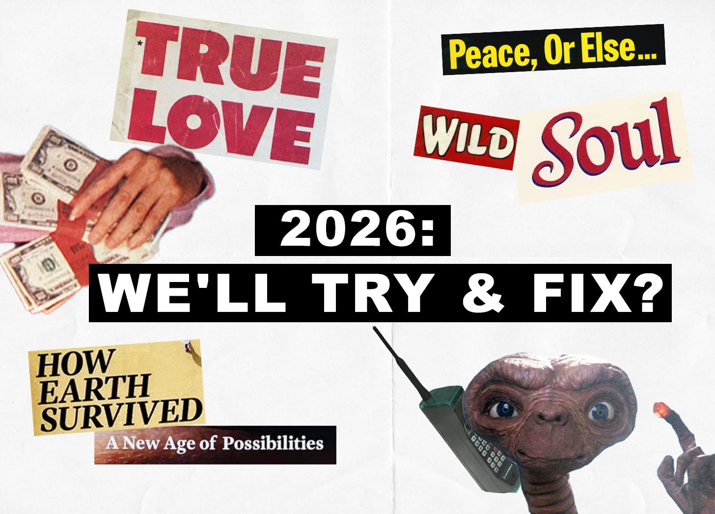 “2026: We’ll Try & Fix?” includes a heavy question mark. I want to be very clear that no one should be bearing the weight of THIS world on their tired shoulders. All we can do is our best, and I don’t know if our best will be enough, but what I do know is that none of us want to spend another twelve months watching the world self-immolate on our demented little phone screens feeling this frightened, angry, and powerless.